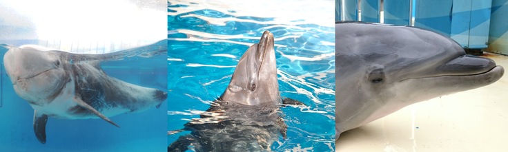 ●サワ(バンドウイルカ):“えのすい”生まれの5世(母はルイ)。体は白く小さく、下顎がしゃくれて出っぱっている(ミューと逆ですね)。