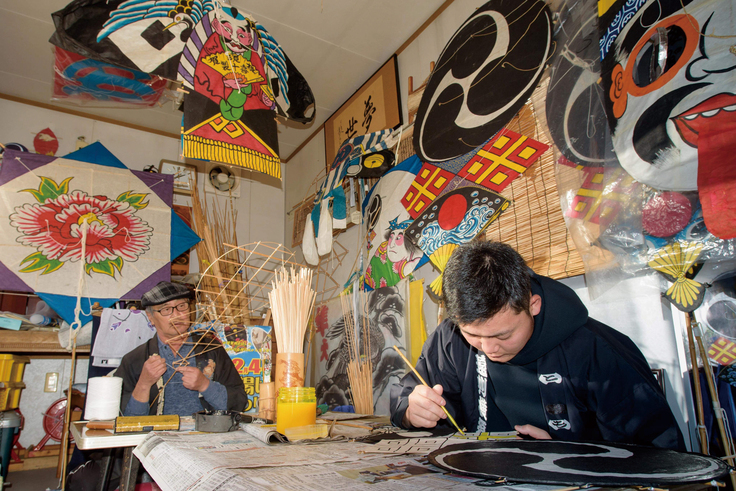 ↑今回「花火夜宴の玉殻」に文字入れをしてくださる遠州横須賀凧職人の石川昇さんと孫の隼大さん
