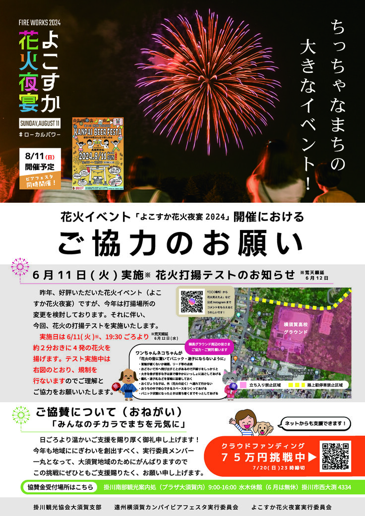 しかし、三熊野神社を中心とした横須賀街道(景観形成重点地区)を麓に抱える山の上にあるグラウンドから花火を揚げるというのは容易いことではなく、消防の厳しい保安基準をクリアしたうえで、打揚場所となる横須賀高校さんや地元の方々の理解が必要。そして、横須賀高校のグラウンドから花火を揚げて、ビアフェスタの会場から花火が見える保証もない。