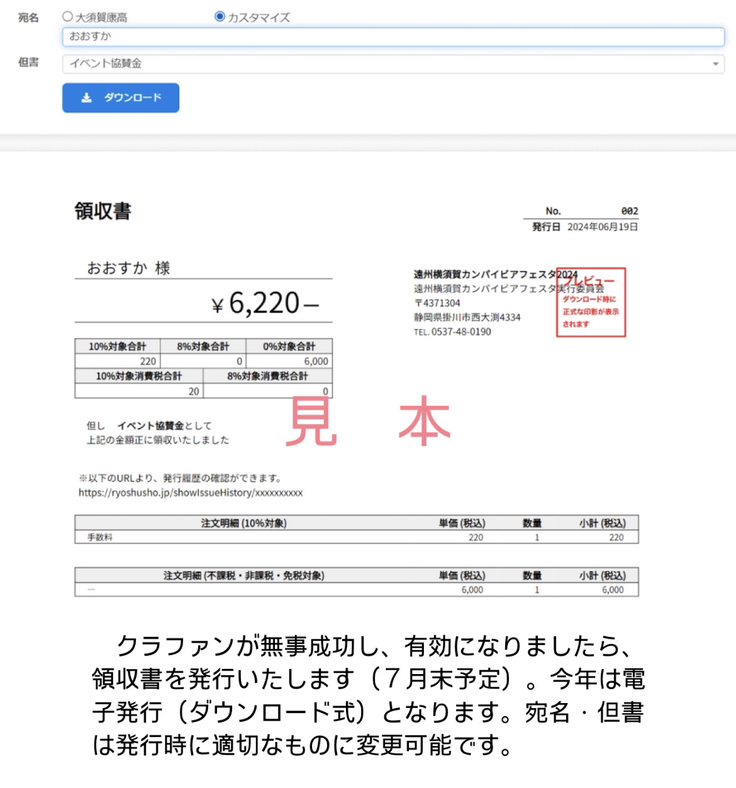 本クラウドファンディングが無事成功し、有効になりましたら、領収書を電子発行いたします(7月末予定)。今年はダウンロード式(DMやメールでURLをお知らせ)となります。宛名・但書は領収書ダウンロード時に適切なものへ変更可能です。