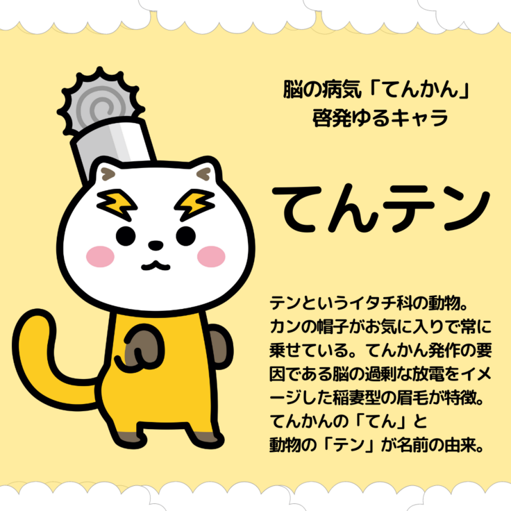 テンというイタチ科の動物がモチーフとなっており、缶の帽子をかぶることで、てんかんを表現しています。また、てんかん発作の要因である脳の過剰な放電をイメージした稲妻型の眉毛が特徴となっており、非常に可愛くみなさんに愛されるキャラクターではないかと考えております。