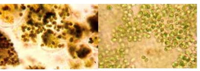 *写真左:通常のアオコ/写真右:超音波派で細胞内の浮袋がつぶれたアオコ