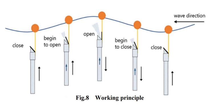 実際使われた逆止弁構造、強度課題があり、小さな波での揚水が難しいと思われる。