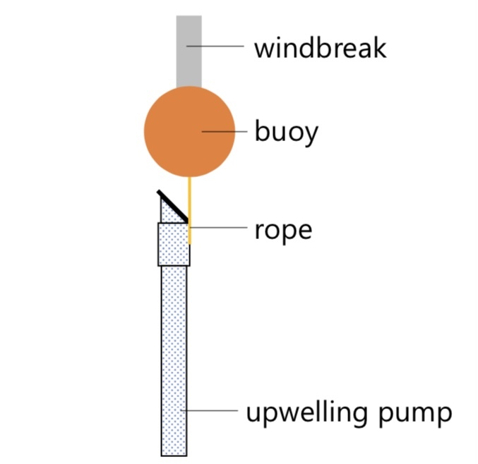 *水深3mから冷水湧昇、中央の丸いブイ下の湧昇ポンプから波力で低層冷水が汲みあがっている。