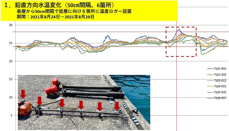 夏場の水深2~3mの水温は海面より1~2℃低い事がこれまでの調査で分かってきました。