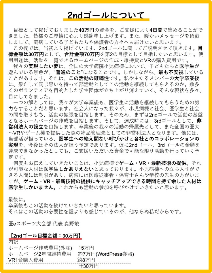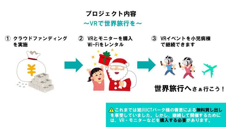 旭川医科大学の医学生が主体となり、旭川医科大学の小児科医、看護師との協力のもと小児科病棟プレイルームにて、VRやゲーム機Switchを用いたイベントを小児病棟に入院している子どもたちや、その保護者のために提供いたします。資金の使途はVRやゲーム機の購入、それを使用するためのWi-Fi環境の整備に用いる予定となっています。
