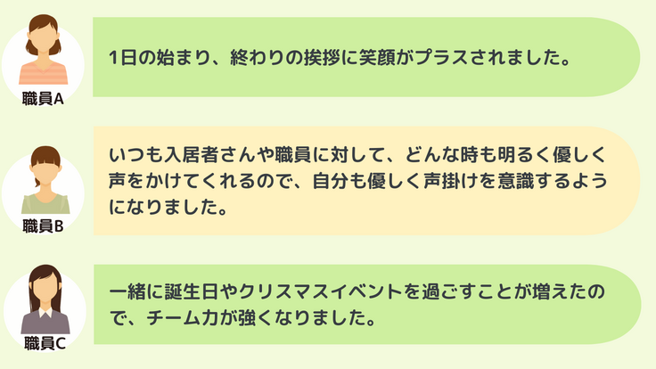 こんな職員の声が生まれる施設を増やすことが、私たちの目指す未来への第一歩だと思っています。