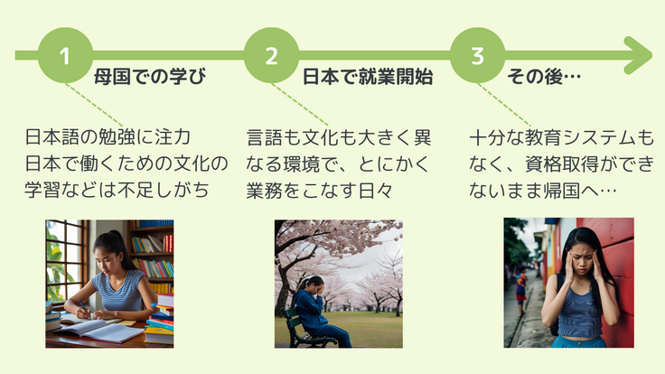 しかしこれまでは、母国にいる間に来日後のキャリア形成に関する学習が十分になされていなかったり、受け入れる日本の施設側が彼らを「人手不足を埋める存在」としてとらえてしまい、力を十分に評価できないために勉強の機会を提供できなかったりと、彼らのキャリアパスが閉ざされてしまうケースも見られました。