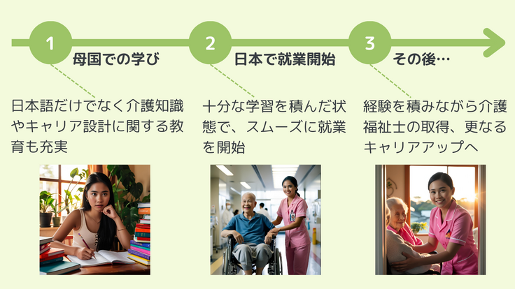 例えば、「日本語・介護知識の教育プログラム」として、「日本式の介護の詳細やキャリア形成に関する知識、日本人のチームプレーなどの文化的特徴、制度」といった新たなカリキュラムも組み込み、フィリピンの若者たちが「日本でキャリアを積みたい」と思える場所を整えます。