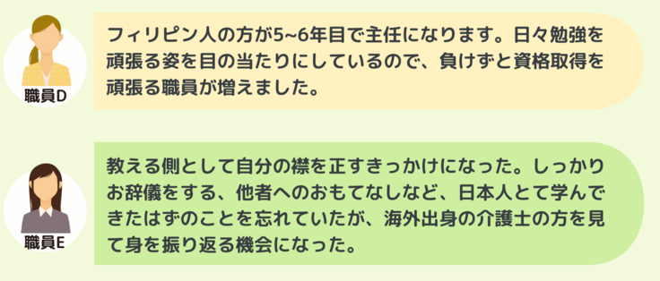 例えば、海外出身の介護士の明るい空気が日本人の介護士にも広がり、施設全体によい空気をもたらす効果が生まれているという声もあります。