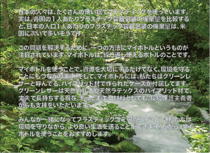 本体ケースはグリーンレザーで作ります。グリーンレザーはパルプとラテックスのハイブリッド材料で、どちらも天然由来の材料です。日本ではまだ、認知度が低いですが、海外の時代の流れに敏感なデザイナーにより、お財布やポーチなどに積極的に展開されてます。材料の厚みは0.5ミリで、本革の弾力性と和紙のような心地いい感触が大きな特徴です。そして、耐水性が優れおり、少しぐらいの水では水玉となります。このケースに入れておくことで、より、保温性と保冷性が高まります。本体のシワはそれぞれのケースに固有なもので、使い込むほどに味わい深くなります。ぜひ、お楽しみください。