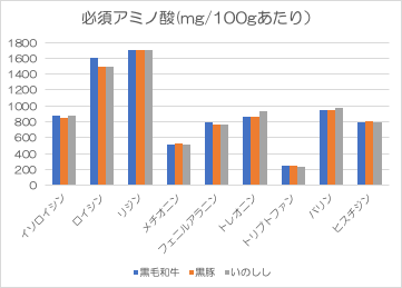 いのしし肉のたんぱく質を構成するアミノ酸のうち、人の体内では合成することができない必須アミノ酸の含有量を牛肉(黒毛和牛)や豚肉(黒豚)と比べるとほぼ同等で良質なたんぱく質です。