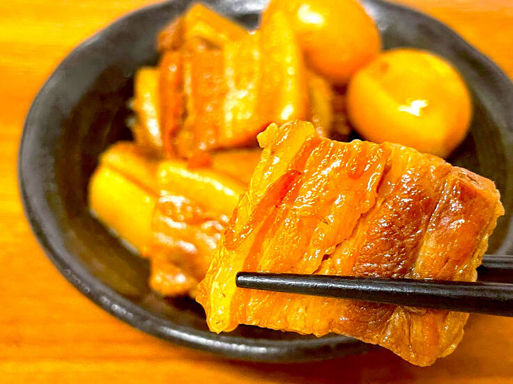 <角煮> 猪の臭みはどこへやら。。。醤油・焼酎・生姜で煮ることで味わい深い中にも従来の豚の角煮よりも後味さっぱり。隠し味でニンニクも入っているから満腹感も味えるように仕上がっています。
