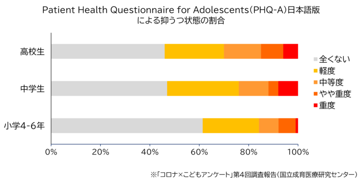 国立成育医療研究センター(2021)の「コロナ×こどもアンケート」第4回調査報告によると、小学4~6年生の15%、中学生の24%、高校生の30%に、中等度以上のうつ症状があり、小学4年生以上の子どもの6%が「ほとんど毎日」自殺や自傷行為について考えた(「死んだ方がいい、または自分を何らかの方法で傷つけようと思った」)と回答し、コロナ禍において、子どもたちのメンタルヘルスの問題はより深刻化しています。