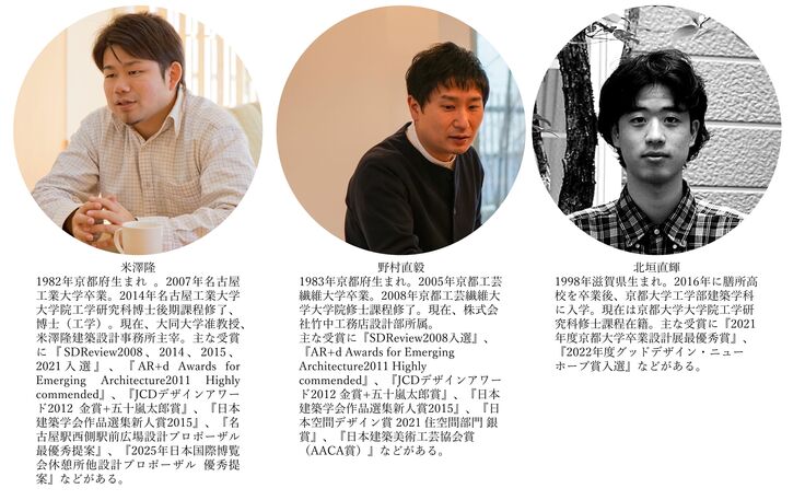 そんな空間を作るため、今回は米澤隆建築設計事務所・建築家の野村直毅氏・京都大学工学研究科建築学専攻の北垣直輝氏をにご協力いただきます。今回の試みをはじめるにあたり、多くの建築家の方とお話をしましたが、「異種共存」を一つのテーマとしてデザインづくりに取り組まれている点が、私たちの試みと重なり、共に新たな空間を作っていただくことをお願いしました。