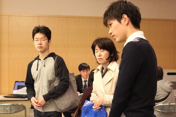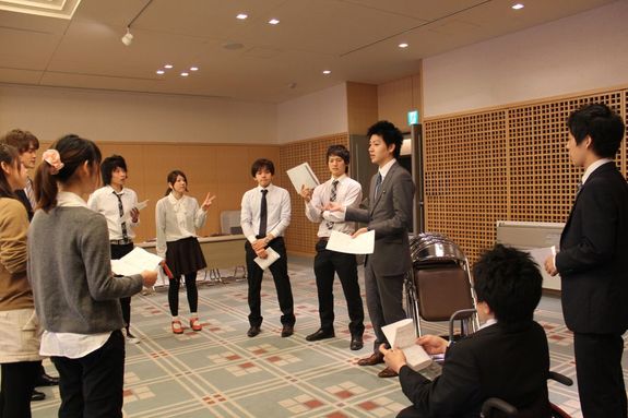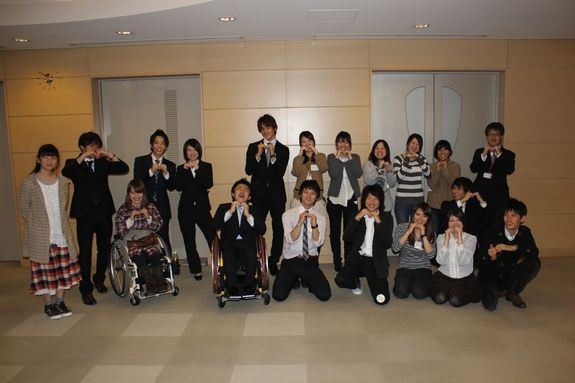 ミライロ先生一同、熱心に最後の打ち合わせをしています。…あれっ,一人だけピースしてますね。笑