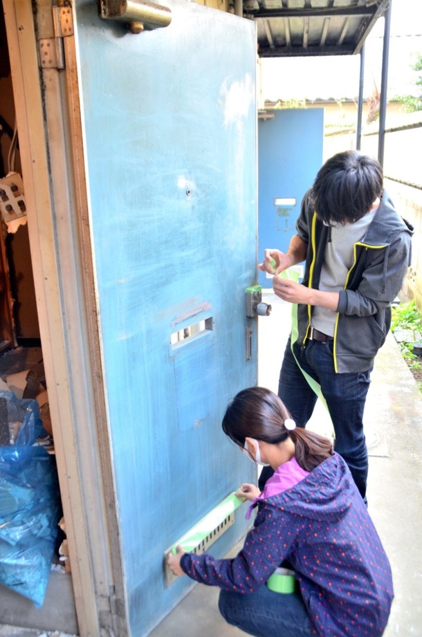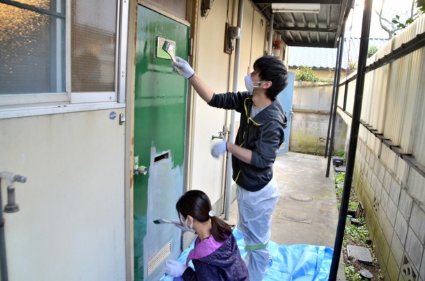 表面の汚れをサンダーで削り落とすと、徐々に地の色が見えてきます。ドアノブなどを養生し、靴や洋服にペンキが飛ばないようレインウェアなどでガードを固めたら、いよいよペンキ塗り開始です。