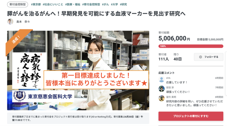 皆様の力強いご支援により、プロジェクト公開一週間という短期間で、第一目標である500万円を達成することができました!ご支援くださったおひとりおひとりに、膵がんに対する様々な思いがあることも改めて知り、研究者として背筋が伸びる気持ちです。