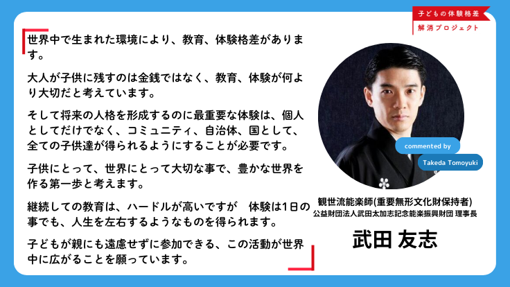 観世流能楽師(重要無形文化財保持者)で公益財団法人武田太加志記念能楽振興財団の理事長を務めるの武田友志さまより応援メッセージをいただきました!