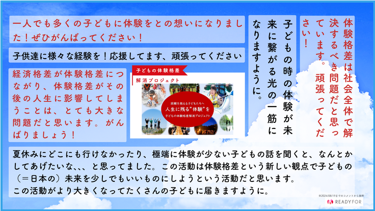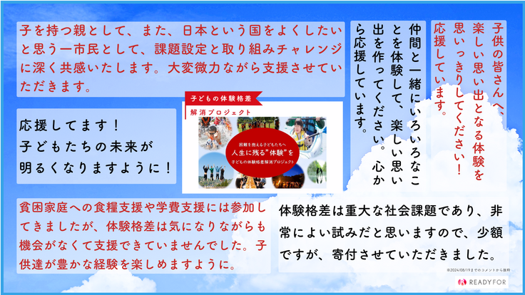 そしてご支援とあわせて、皆様からいただくメッセージを、関係者一同大変嬉しく拝読するとともに、子どもたちへ一生の体験を提供できるよう全力で取り組んでいこうと、身の引き締まる思いです。