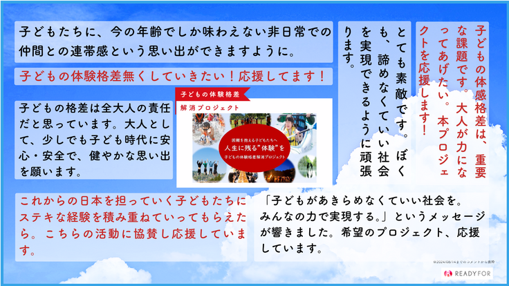 皆さまからの子どもたちへの想い、体験格差解消へのメッセージにとても勇気づけられます。
