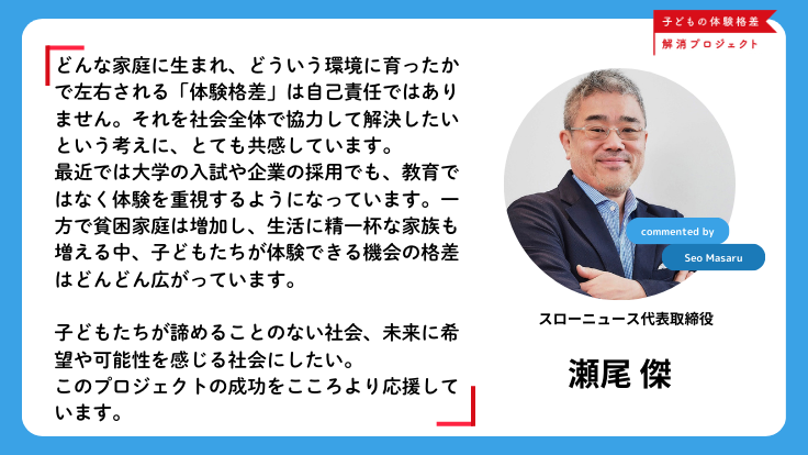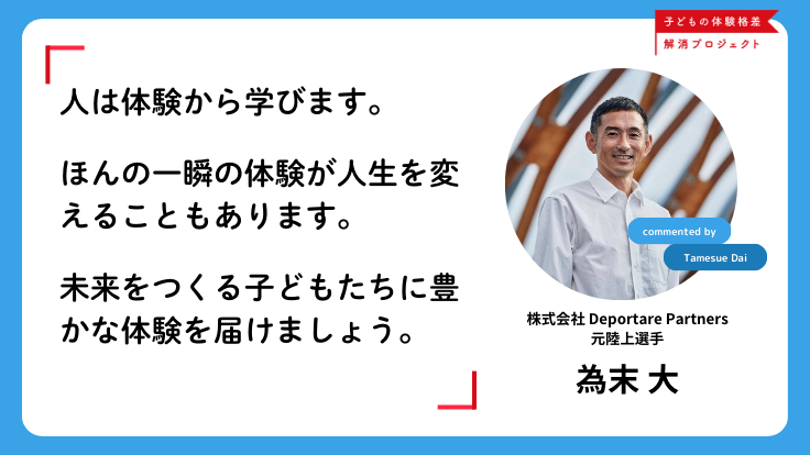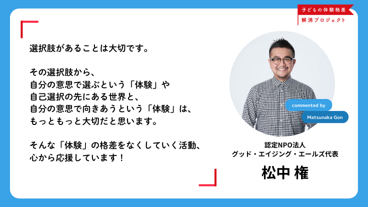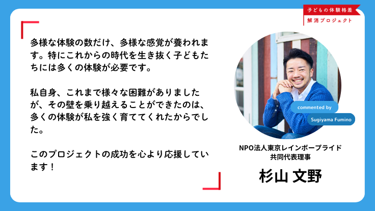 子どもの体験格差解消プロジェクトでは様々な業界で活躍されている方から応援メッセージをいただいています。