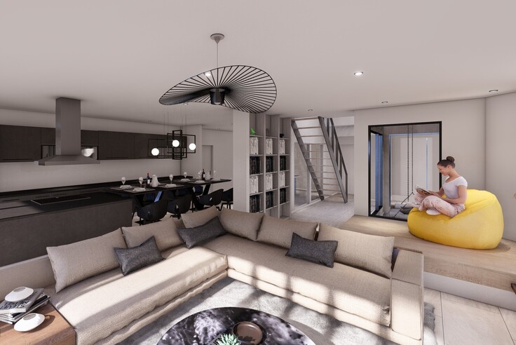 開放感のあるリビングにはアイランドキッチンとソファーの団らんスペース