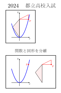 例えば関数と図形は異なる分野で,その複合問題は入試問題の定番です。もともと違う分野の関数と図形をそれぞれ異なる個別の問題として分離し単純化する数学的考え方は自然と思われるかもしれません。それにもかかわらず,関数と図形を分離して解いている例は参考書や問題集,ネットの解説を含めこれまで一度も見たことがありません(もしあったら教えてください)。どれも,関数の式を図形の位置座標として使い,算数的な筋道をたどる考え方をしています。科学的手法の「分割して単純化」を行っていませんし,過去の教育でも教えられていません。分割して考えるとは,関数の条件,図形の条件,ときにはもう一つ範囲の条件,それぞれに対して別々に数式をたて,いずれに対しても満足するような解を「機械的に」求めるということです。実際には各条件(具体的)をそれぞれ方程式に翻訳(抽象化)して,連立方程式を解いて解を求める(具体化)ことをします。条件を数式に翻訳するのはどの順番からでもよく,「筋道をたてることを回避」しています。