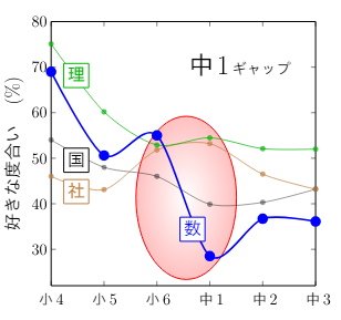 中学入試の特殊算という応用問題は難しく「まるで手品のような巧妙な工夫をしないと,答が出ない問題だ」(湯川秀樹)。そのわけは,算数の応用問題は頭の中で一歩ずつ「コツコツ」と筋道をたててひとつ前に計算した値を踏み台にしながら答えを導き出さなければいけないからです。この「筋道を立てる」ことがやっかいで,答えまでたどり着くのが迷路に迷い込んだように難しく,直観力が高い手品師だけが解けるようにできています。多くの人が応用問題を解けるようにするためには,「筋道」という迷路を外して考える方法を与えてやる必要があります。そのための解決策として学ぶのが中学数学です。なので,ルール(数学の文法)さえ覚えれば,手品師だけでなく,多くの子たちが理解できる,というような教育をし,数学の学習に対して自信をつけさすことが教育者の責務と私は考えます。それなのに,調査報告書が示したように,数学を苦手にさせ,きらいにさせるという教育を行う意味が分かりません。