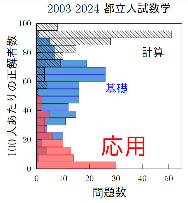 長年学力,特に数学の学力低下が叫ばれています。図は22年間にわたる8万人あまりの都立高校受験生の成績を分析した結果です。計算問題(斜線)はほとんどの受験生が正答していますが,この22年間応用問題(赤)は,100人あたり5人未満(多くてもクラスに 1, 2人)しか正解していないという問題が飛びぬけて多いという結果です。ここでいう応用問題とは毎年4問出題される大問の最後の問題4問をいいます。公立高校入試数学でときどき正答率0.0%という問題が話題になります。こんな科目は全受験科目中数学だけです。理工系大学に進学する割合が20%ある中,そのほとんどの学生が中学校の応用問題を理解していなかったというのが現実です。いままでいかに計算に偏った教育がなされていたのかがお判りいただけたかと思います。ここまでお読みになった方はきっとこう思うことでしょう。出題者がつくる問題が難しすぎなんだと。私も初めはそう思いました。何年もの過去問を見渡すと,さらに驚くべきことがわかりました。これら応用問題は毎年同じ考え方で解くことができます。毎年同様な問題が出題されていて,出題者側が無理な難問を出題しているわけではなかったんです。少し条件を変えただけで全く違った問題と受験生は思ってしまうのでしょう。国英理社の試験結果を見るとこれほど偏った結果は漢字の読み書きだけです。中学校では「読み書きそろばん」だけは生徒全員にしっかり教育してきたということです。義務教育で唯一の取りこぼしである数学応用問題。ここに教育委員会をはじめとした行政は危機感を持ってもらいたいものです。