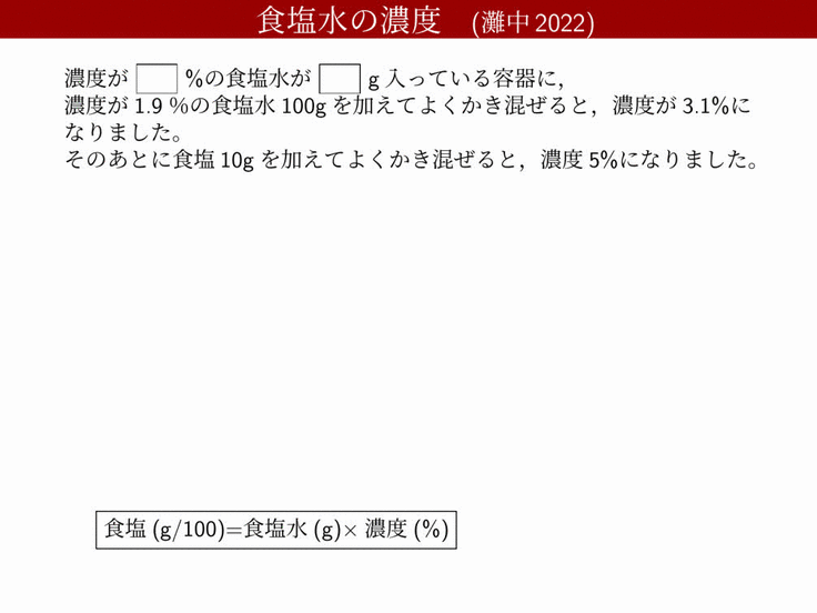 灘中に使用許可をいたいたので,食塩水の問題を連立方程式を使って解く例題としてアインシュタインのこの言葉に沿って解説します。