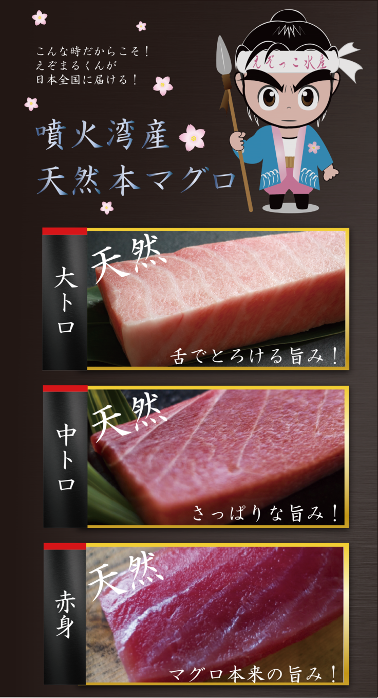 この機会に北海道へ国内旅行にいけない日本中の皆様に笑顔をお届けしたいというえぞまるくんの気持ちと、生産者の皆様のご協力により今回のプロジェクトが実現できることになりました!漁師も舌を鳴らす絶品の「本マグロ」をぜひご自宅で楽しんでください。 えぞまるより