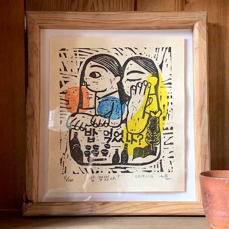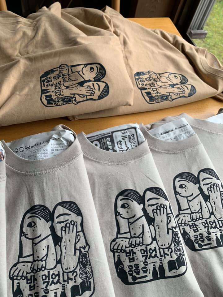 七夏さんは、自分の絵で劇団石(トル)のイメージを出すのも一つだけど、もう一つ…せっかくならハングル入れたいと思い、きがんちゃんに「なんかいい言葉ないかな?」と尋ねます。返ってきた返事は、「ご飯食べたか?/밥 먹었나?(パン モゴンナ?)」でした。