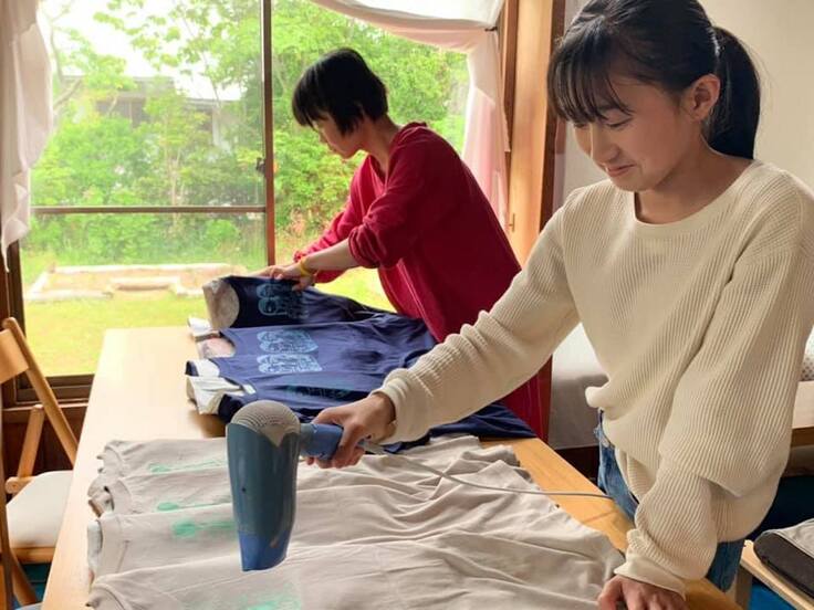 劇団石(トル)のTシャツやエコバッグを作る日もそう。きがんちゃんの家を使って製作が行われるのですが、摺るのは七夏さんで、きがんちゃんは応援担当。
