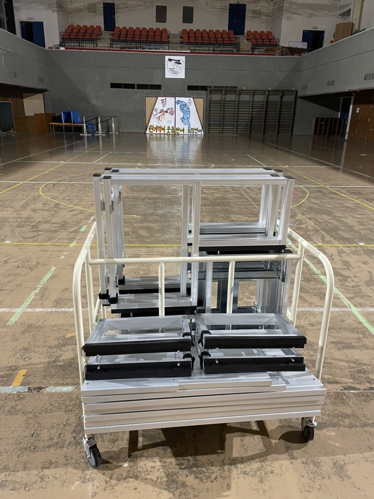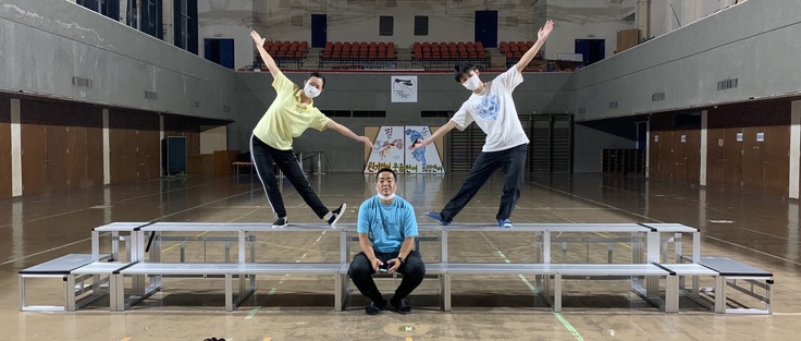そして、福岡朝鮮初級学校にも、新しいひな壇が到着しました。さっそく先生方が体育館で組み立てて、写真を撮ってくださいました↓