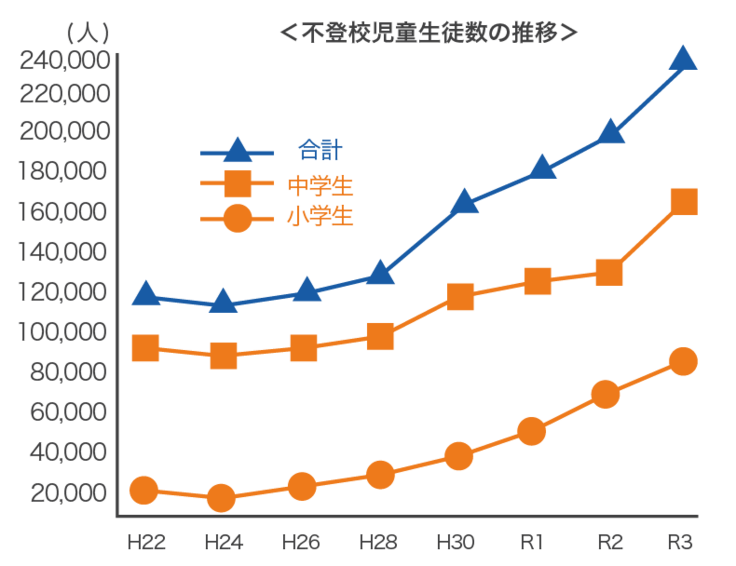 文部科学省の調査では、2021年度の小・中学校の不登校の児童生徒数(年30日以上の欠席)は、全国で約24万4000人と前年度約19万6000人から24%も急増しています※1。