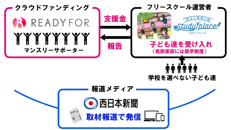 西日本新聞は報道機関として、取材報道およびプロジェクトの発信を担います。支援金は受領せず、ReadyFor手数料を除いた全額をエデュケーションエーキューブへの支援に活用いたします。