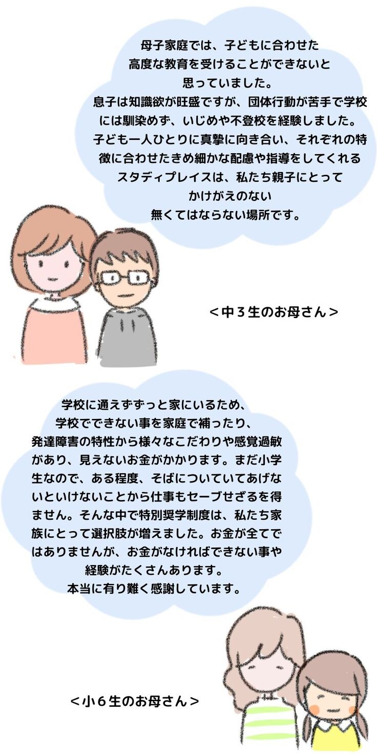 スタディプレイスでは、ひとり親世帯や住民税非課税世帯等の経済的な困難を抱えている世帯を対象に、寄付を原資に授業料の50〜70%を減免する独自の奨学制度を提供しています。