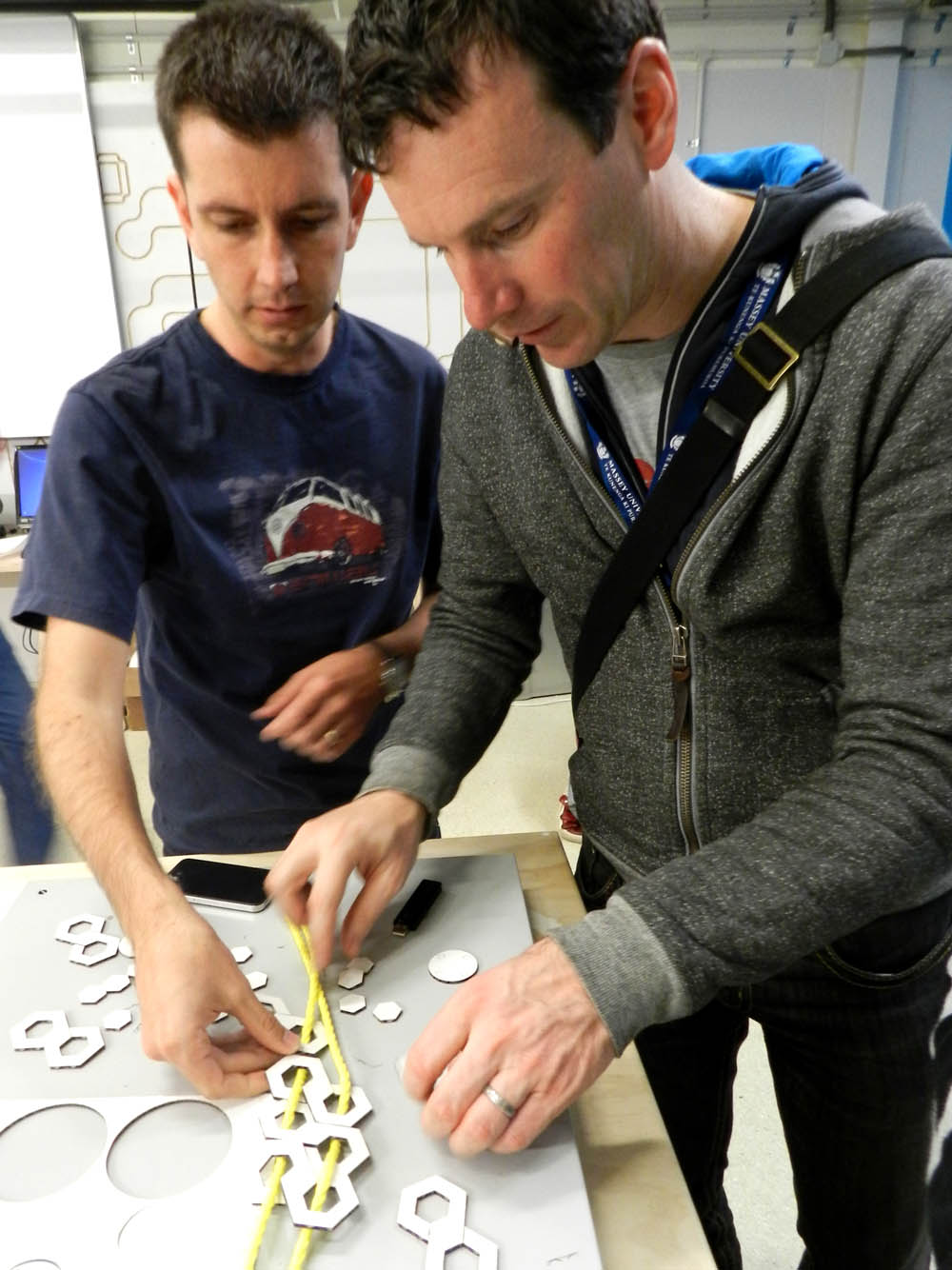 しかしながら、ここで同じことをやっても、面白くありません。そこで、「編む」という動作を織り込んだピースという方向になり、ピースの集合体のような「ハンモック」に決定しました。国境を越えて「あーだ、こーだ」と真剣に話し合い、結局、今夜はラボが開いている夜10時迄制作を続けていました。