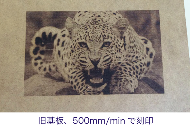 例えば、このヒョウの写真を木材板に刻印したもの。 これまでの旧基板ではこの鮮明さで刻印するにはレーザーヘッドのスピードを500mm/min程度のかなり低速で加工する必要がありました