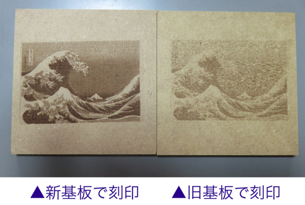 細かい話をすれば新型の一体型基板によるメリットは様々あります(例えば生産における歩留まり率の改善など、、)が、 ユーザーの皆様にとって一番のメリットはラスター加工(画像データをもとに一行ずつ刻印するような加工)において、これまでよりも速く・キレイに加工できるようになることです!