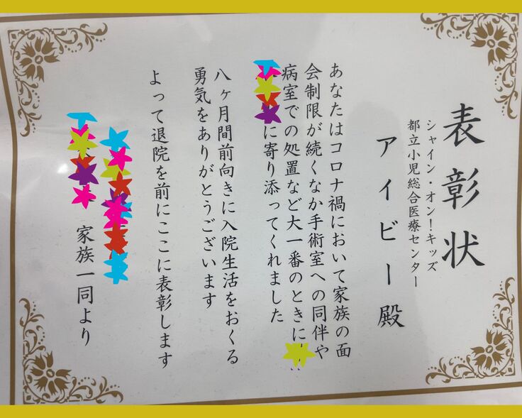 「突然の入院で真っ暗な気持ちになってしまっていた中、タイちゃんと過ごす時間だけは僕にとって特別なキラキラした時間だった。君の存在があったから笑顔で頑張れたよ。ありがとう、これからもよろしくね。」