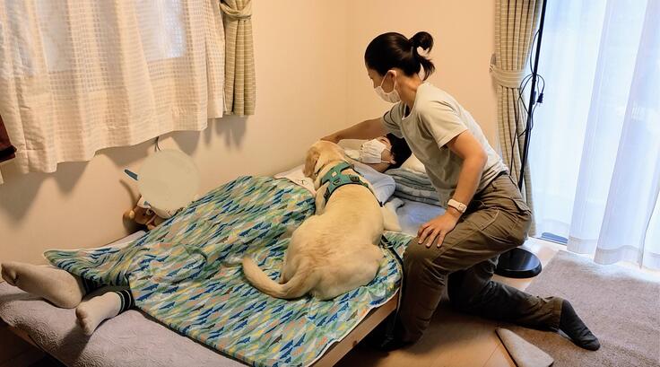 次に、添い寝のための訓練に入りました。まず、誰もいないベッドに昇り降りし、続いてベッド上で寝そべる練習をします。平沢さんは、ニックがコマンド通りに動けると、笑顔で大きく褒め、ご褒美のおやつをあげます。褒められてうれしそうなニックは平沢さんのことを大好きなんだなというのが伝わってきました。候補犬とはいえ、とても賢く、コマンドを的確に理解していることに驚きました。