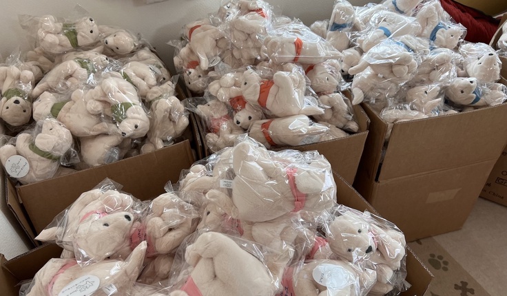 箱から出た途端、すごい量になったぬいぐるみ達。入れるぬいぐるみの名前を叫びながら、頑張って梱包しました。かたや、わんこ5頭はドッグランで大騒ぎ。仲良くお昼寝もして、ファシリティドッグチームの全員の協力で何とか発送作業を終わらせることができました。