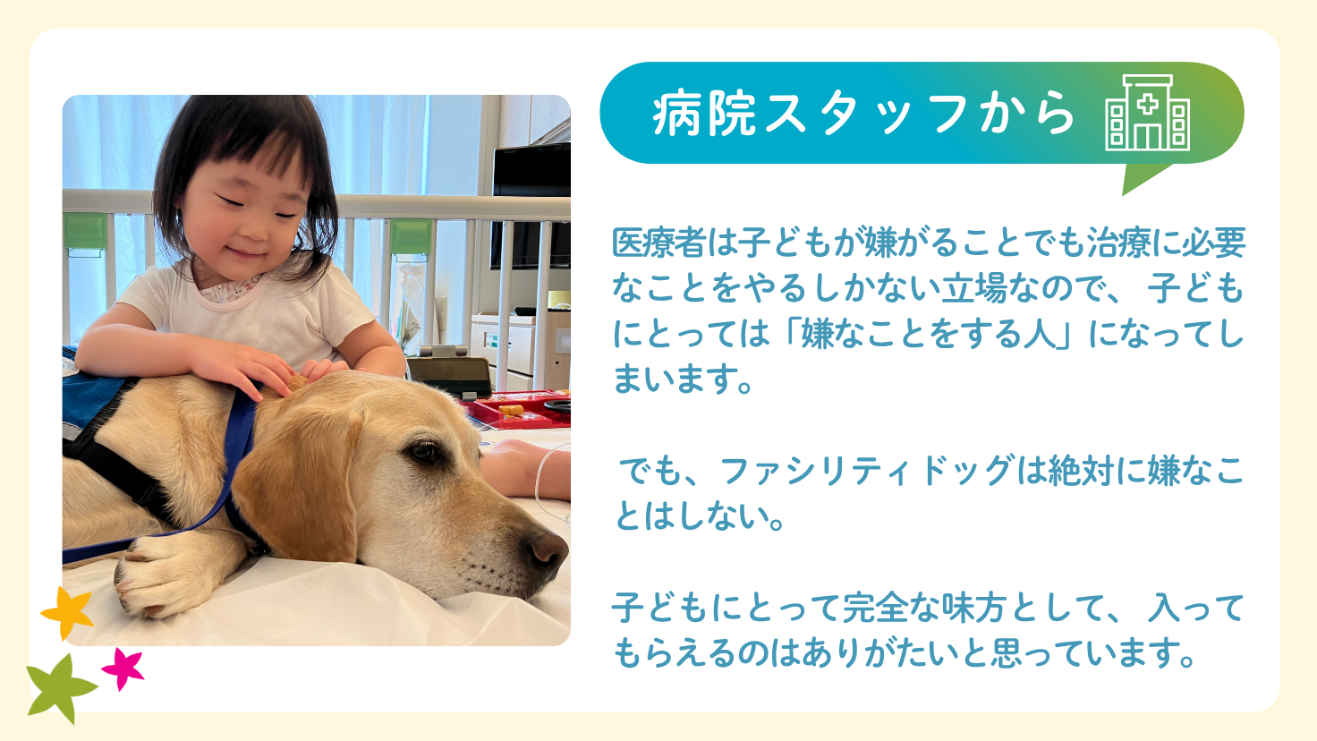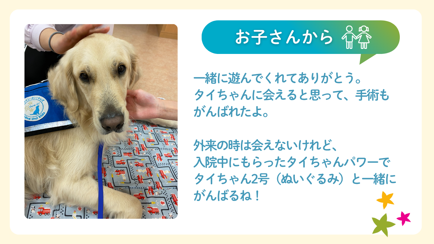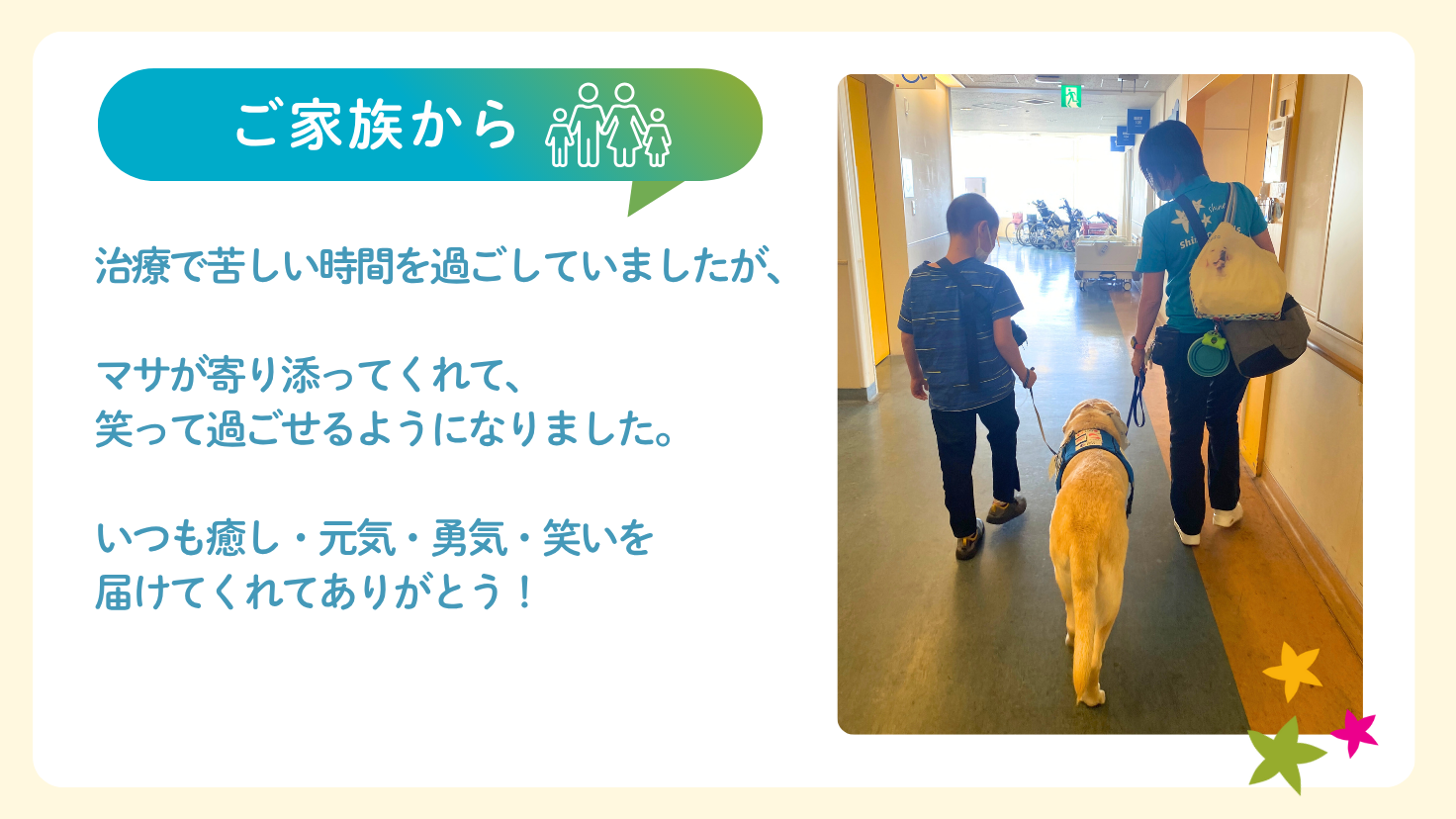 言葉はなくとも、ファシリティドッグのおおらかさや朗らかな存在感に励まされ、「また会いたい!」という想いが治療に向き合う気持ちの支えになった、というお声をいただいています。