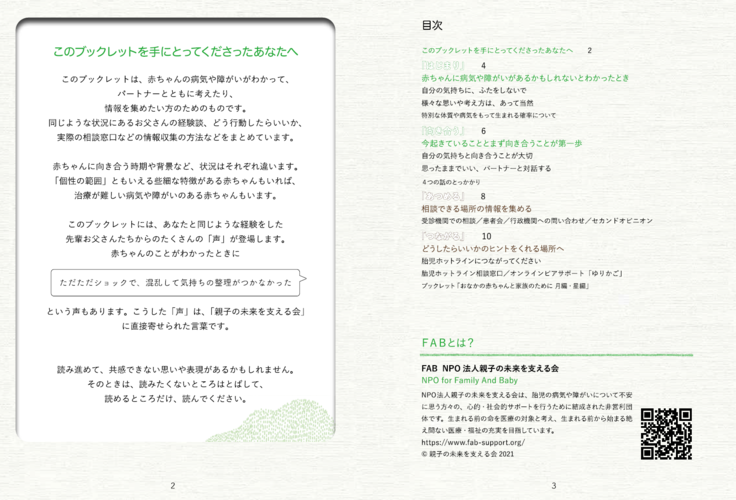 ブックレットの内容として、赤ちゃんの病気や障がいがわかって、パートナーとともに考えたり情報を集めるために、同じような状況にあるお父さんの経験談、どう行動したらいいのか、実際の相談窓口などの情報収集方法などをまとめています。