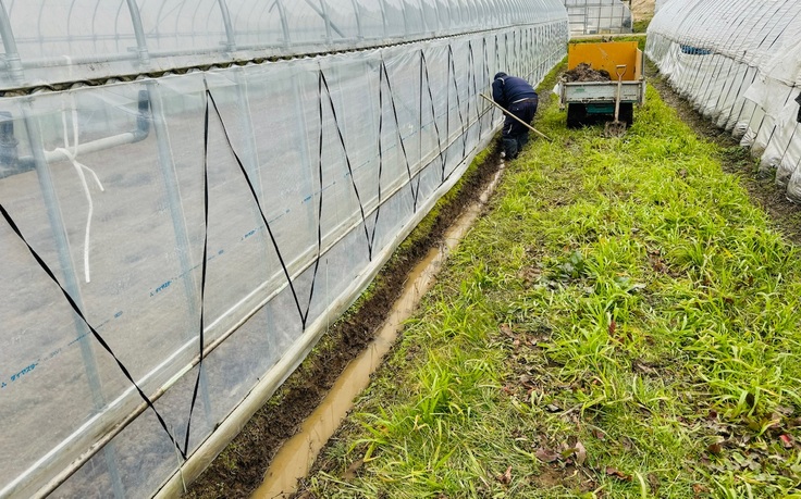 地震により畑全体が傾き、本来排水されるべき方向と逆になっています。