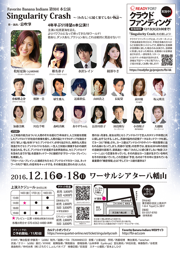 はじめまして。演劇ユニット『Favorite Banana Indians』代表の息吹肇と申します。98年の創設以降、東京の小劇場を中心に活動し年間1〜3本の作品を上演しています。最近は、ライブハウスで生バンドやピアノ弾き語りアーティストとのコラボレーション公演を行う等、新しい形態を模索しています。僕たちの作品は、「人間にまつわるすべてのこと、とりわけ表面には見えない、深い部分を描くこと」を中心としたエンターテインメント性の強さに特徴があり、今回は4年3ヶ月ぶりの劇場本公演として、かなり大がかりなSF大作をすることになりました。