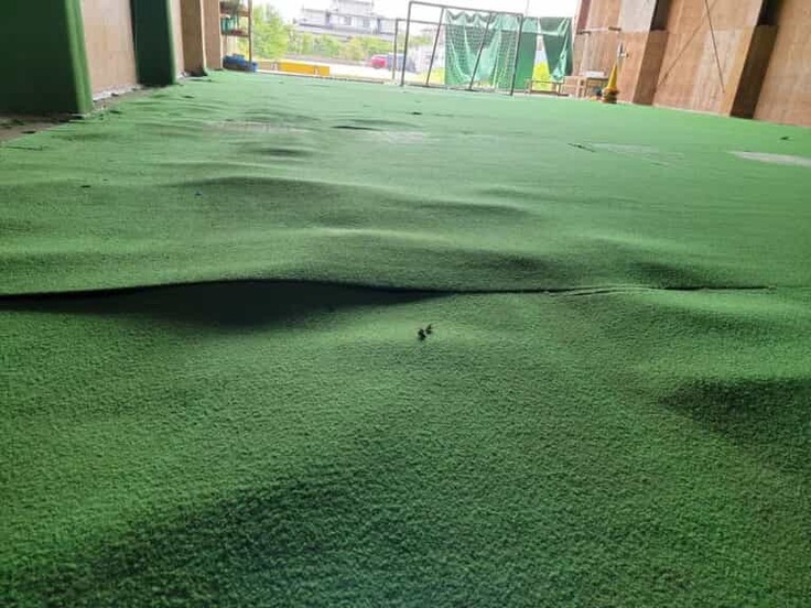 人工芝の下に敷いているゴムマット一枚一枚が水を吸い込んで膨らんでしまったので、人工芝を1枚ずつ剥がしてゴムマットの膨らんだところに切り目を入れて平らにならす作業をスタッフや保護者の皆さんが行ったと聞いています。