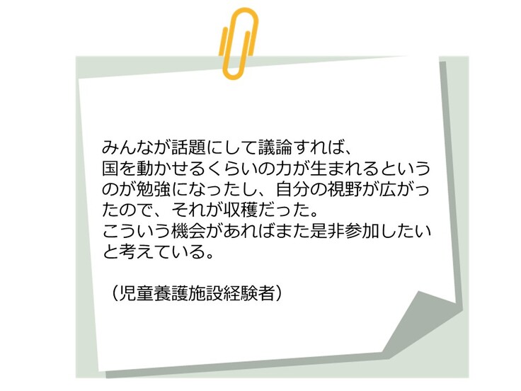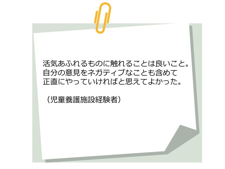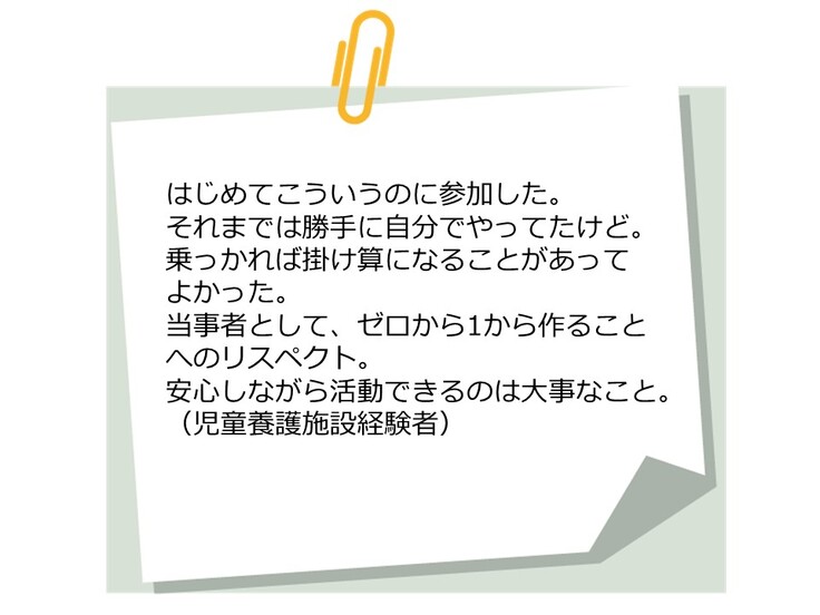 それでも今の自分たちにできることを探し、社会的養護出身者ならではの視点で1つのことを話し合えることは、貴重な経験だと思います。